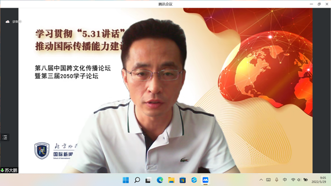 5月29日,北京外国语大学马克思主义学院在线上举办“学习‘5.31’讲话精神 提高国际传播能力”学术研讨会。北外党委副书记苏大鹏出席会议。中国社会科学院马克思主义研究院党委书记辛向阳、清华大学马克思主义学院院长艾四林、中国外文局当代中国与世界研究院治国理政中心主任王洪波等专家学者在云端相聚,共同学习回顾习近平总书记“5·31”讲话精神,研讨我国国际传播能力建设问题。会议由北外马克思主义学院院长韩强主持。