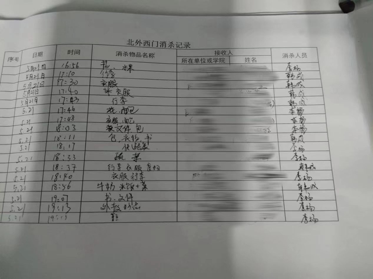 马克思主义学院“青年突击队”以两人为一组,六人为一队,从早上八点到晚上八点在西门全天值守。主要工作任务是对入校生活物资进行消毒、登记,避免学生与家长、社会人员与校内人员直接接触,切断社会病毒输入源头,保障校内安全运行。运行一段时间以来,值守人员不顾炎热酷暑,不喊苦不叫累,对入校的每件物品仔细检查,做到全方位消毒后再转交给校内人员。下一步,学院将继续按照学校疫情防控工作的要求和学院党总支的部署,认真做好志愿者招募工作,带领全院师生为疫情防控大局做出应有的贡献。