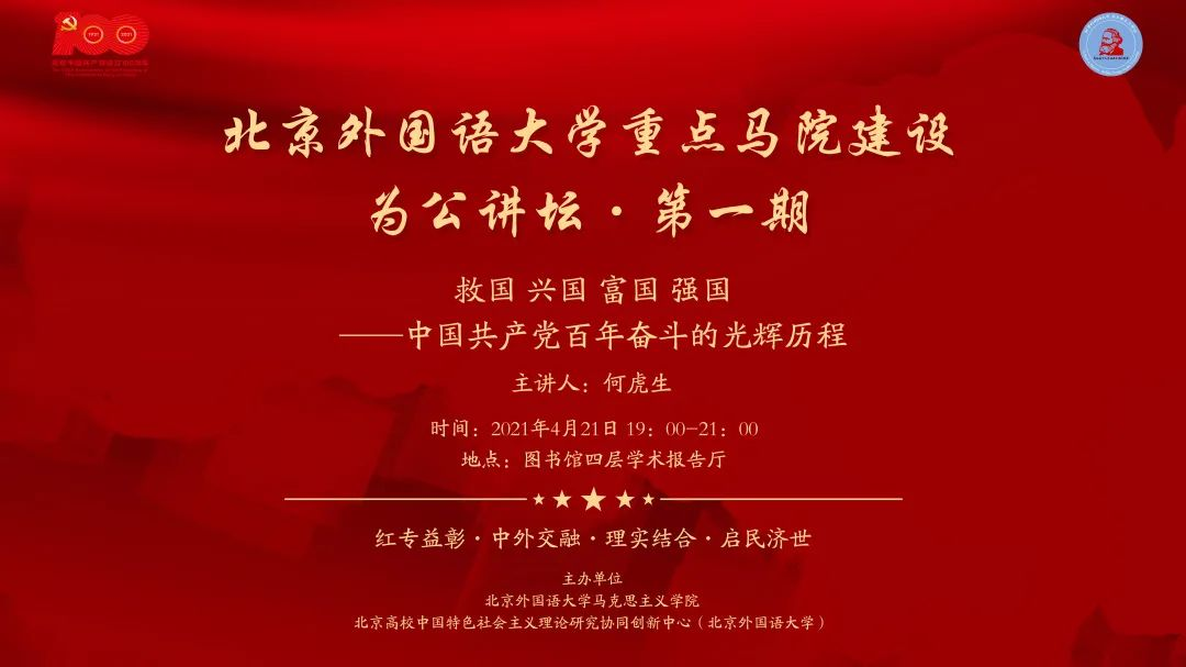 4月21日晚,马克思主义学院“为公讲坛”名师专家系列讲座第一讲在图书馆四层学术报告厅举办。中国人民大学马克思主义学院教授、博士生导师,中国人民大学中共党史党建研究院副院长何虎生教授以“救国·兴国·富国·强国——中国共产党的百年奋斗历程”为题为全院师生做了精彩报告。