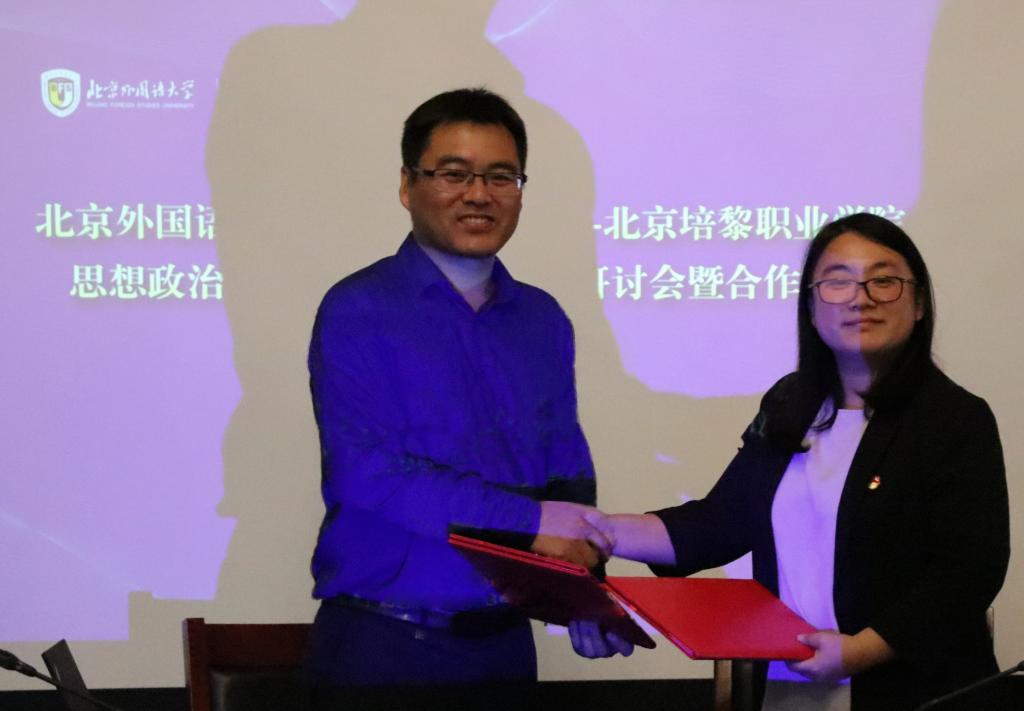 最后,在双方与会人员见证下,北京外国语大学马克思主义学院党总支书记祝和军与北京培黎职业学院院党委委员、教务处处长李伟丽签署了思想政治理论课共建帮扶合作协议。按照协议约定,双方将围绕思政课教师队伍建设、思政课教学改革、思政课集体备课、课程观摩、教研课题申报、教学学术会议研讨等多个方面开展深度合作。