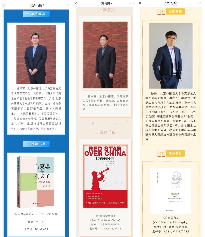 2020年7月,我院与外研书店合作开展“青年马克思主义读书会”活动,该项目旨在践行习近平总书记在全党号召的“读马克思主义原著,悟马克思主义原理”的重要指示精神,依托外研书店的阅读氛围,引导广大青年深入阅读马克思主义经典,品悟马克思主义真理,现已成为海淀区新时代文明实践基地推出的定期宣讲、传播马克思主义创新理论的重要活动,吸引了众多读者参与。目前该项目已成功举办20期,被评为“2020海淀区优秀文明实践志愿项目”,并被中央电视台、北京电视台等多家单位报道,取得广泛社会反响。
