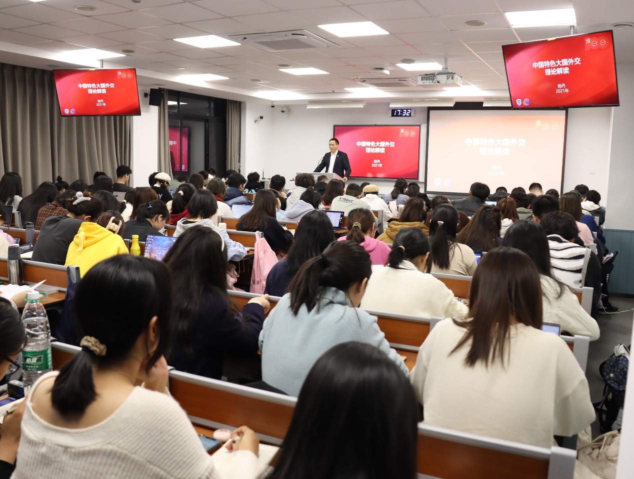 12月8日,北京外国语大学校长、党委副书记杨丹教授在逸夫楼为国际商学院2021级本科生讲授了题为《中国特色大国外交的理论解读》的形势与政策专题课。