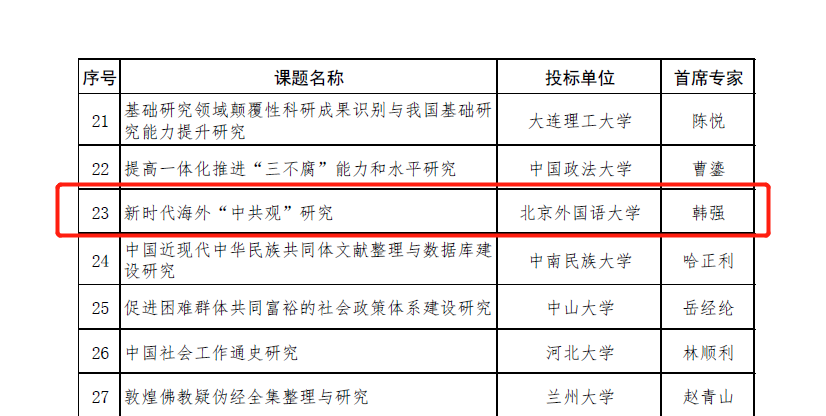20221229日,教育部办公厅发布《关于2022年度教育部哲学社会科学研究重大课题攻关项目立项的通知》(教社科厅函[2022]50号),根据《通知》,2022年度教育部哲学社会科学研究重大课题攻关项目共有51项批准立项,我院韩强教授作为首席专家领衔申报的《新时代海外“中共观”研究》成功获批立项,项目编号:22JZD023