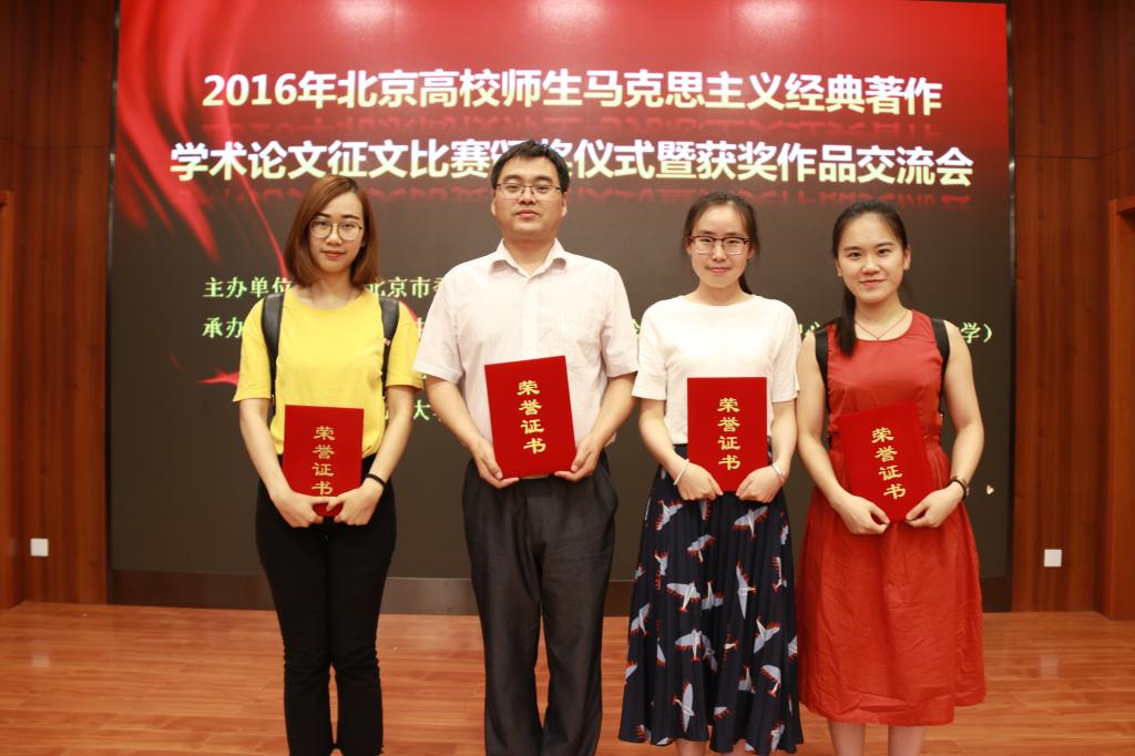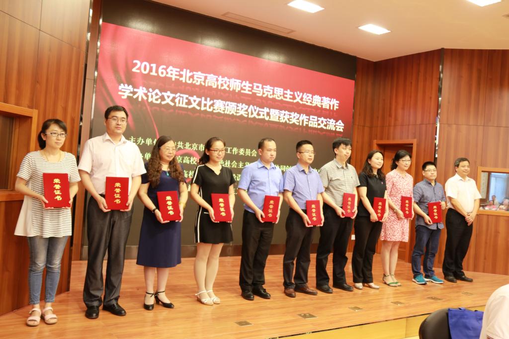 近日,2016年度北京高校师生马克思主义经典著作学术论文征文比赛结果揭晓,我校师生所参评的17篇学术论文在此次征文中获得奖项。其中,教师和博士组,我校荣获一等奖一名,二等奖三名;硕士生组,我校获二等奖一名,三等奖两名;本科生组,一等奖两名,二等奖两名,三等奖六名。同时,我校因在此次学术论文征文比赛中组织工作得力突出,获得优秀组织奖。6月26日,论文比赛颁奖仪式暨获奖作品交流会在中央民族大学隆重举行。党总支书记祝和军作为获奖作者在大会上做了交流发言。