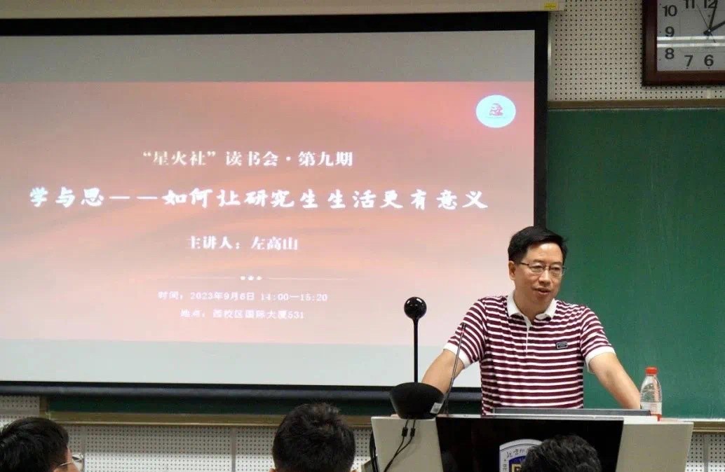 问渠那得清如许,为有源头活水来。9月6日下午,马克思主义学院第九期“星火社”读书会在国际大厦531教室举行,2023级全体研究生参加了读书会。马克思主义学院博士生导师左高山教授为同学们带来《学与思·如何让研究生生活更有意义》的专题讲座。左高山以“苏格拉底之问:人究竟怎样活着才有意义”为切入点,带领大家探讨研究生阶段的特点和意义,并就如何正确处理师生关系、同学关系和论文写作等问题对同学们进行了深入指导,鼓励大家要善于阅读、勤于思考、勇于实践,度过难忘而有意义的研究生生涯。