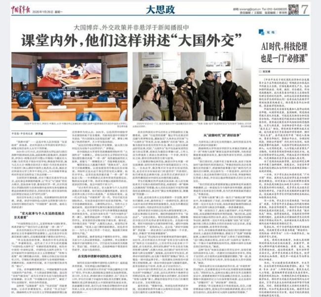 1月26日,《中国青年报》大思政专题“课堂内外,他们这样讲述‘大国外交’”刊发了北外思政课育人成效为主要内容的专题报道。2023级国际关系学院本科生朱怡璇,马克思主义学院副院长王曼倩、形势与政策教研室主任李建嵘接受了专题采访。采访内容详实介绍了北外思政课指导学生将宏大叙事与个人生活连接,在实践中理解中国特色大国外交,从读懂时代到讲好中国故事的建设实践和育人成效。