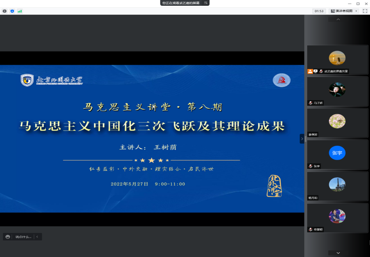 5月27日上午,北外马克思主义讲堂第八期活动在线上成功举办。北京师范大学马克思主义学院二级教授、博士生导师王树荫应邀以“马克思主义中国化三次飞跃及其理论成果”为题做了专题讲座。本次讲座共有校内外师生500余人参加,活动由北京外国语大学马克思主义学院院长韩强主持。