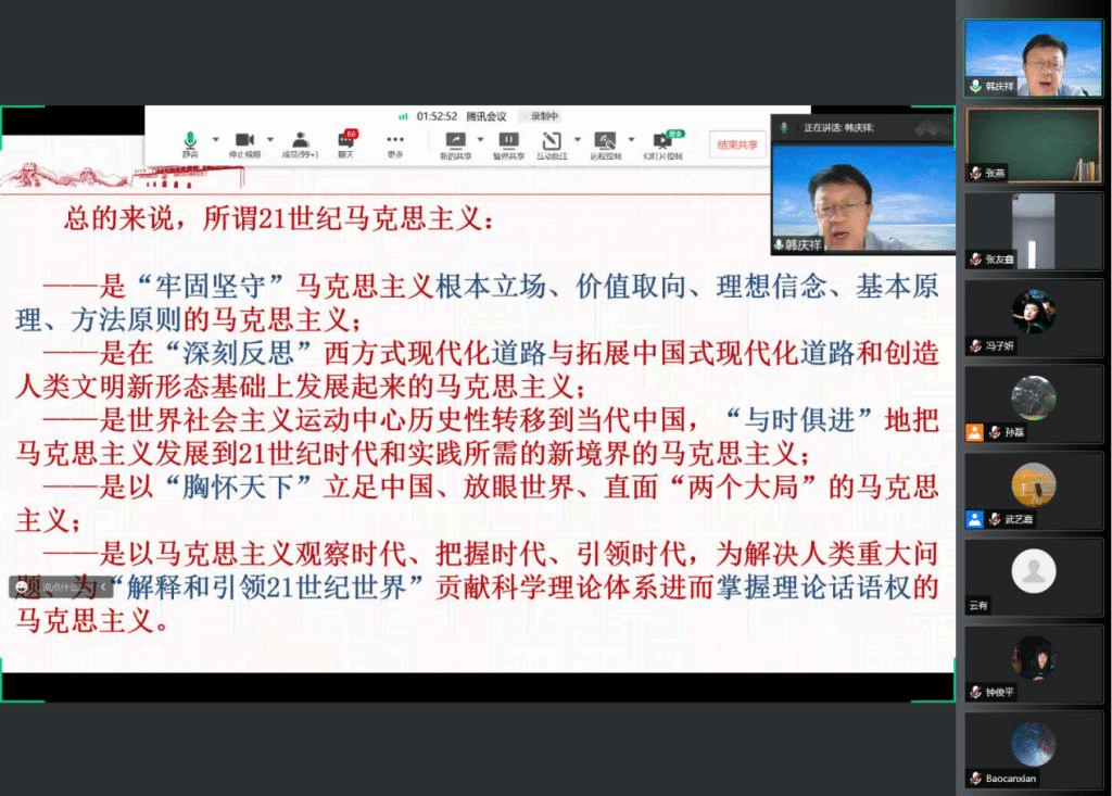 6月9号上午,北外马克思主义讲堂第九期以线上会议的形式成功举办。中央党校一级教授、中央党校专家工作组领衔专家韩庆祥教授受邀出任本次活动的主讲人,并以“21世纪马克思主义的理论阐释”为题做了报告。本次讲座由北京外国语大学马克思主义学院院长韩强教授主持,共有包括北外马院师生在内的全国高校师生300余人参会。