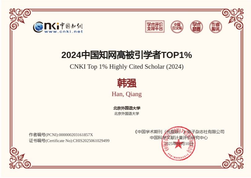 近日,我院韩强教授成功入选“2024中国知网高被引学者TOP1%”榜单。