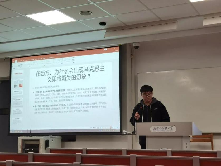 第二位分享的是2021级李杨同学,他首先介绍了作者的学术背景以及本书的写作背景和目的。他指明在西方会出现马克思主义即将消失的幻想,主要有两方面原因,一是资本主义制度经历了至关重要的变革,二是马克思主义者在政治上的无力感。他结合文本以及当前社会的实例,从马克思主义的理论视角以及伊格尔顿本人掷地有声的辩护这两方面说明只要资本主义还存在一天,马克思主义就不会消亡。