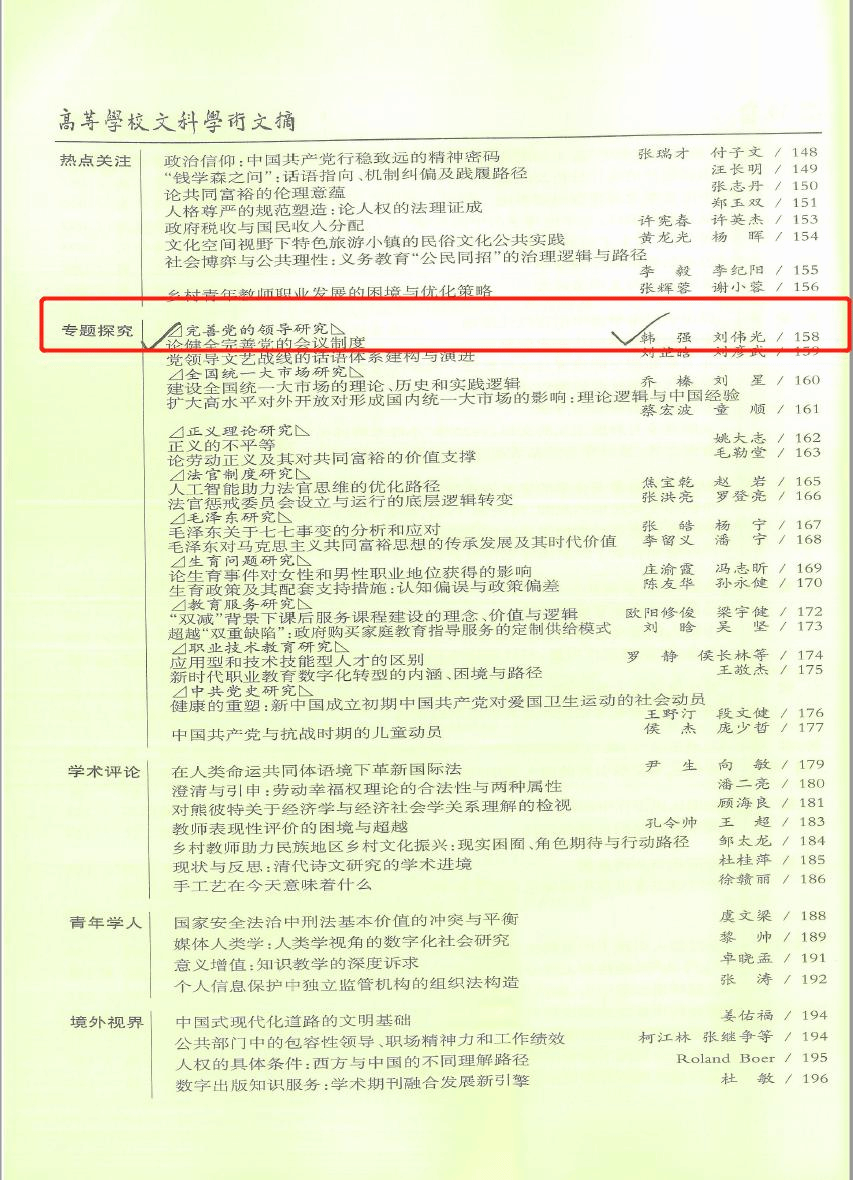 近日,我院韩强教授文章《论健全完善党的会议制度》被《高等学校文科学术文摘》(2022年第6期)全文转载,文章原文发表于《探索》(2022年第5期)。