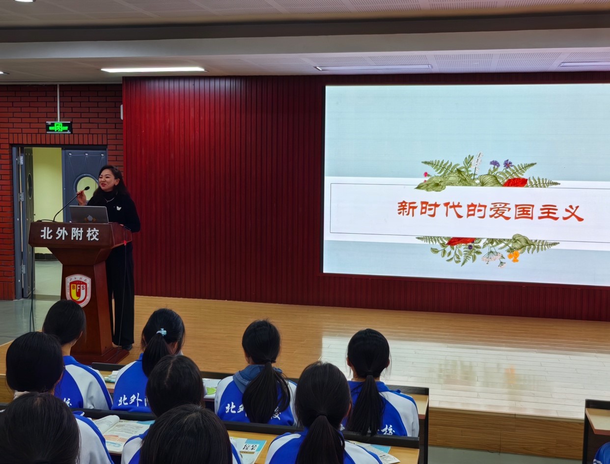 为贯彻落实党的二十大关于 “用社会主义核心价值观铸魂育人,完善思想政治工作体系,推进大中小学思想政治教育一体化建设”的精神,我校马克思主义学院教师刘菁于2023年11月9日下午,赴北京外国语大学附属外国语学校,与附校高中德育处、思政教学一体化课题组联合举办了一场主体为“新时代爱国主义”的讲座。