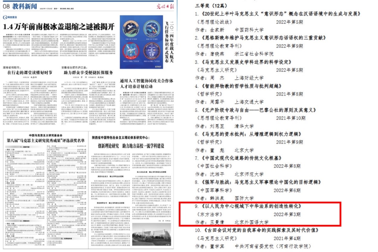 近日,中国马克思主义研究基金会公布了“第八届马克思主义研究优秀成果奖”获奖名单,全国共有20篇论文获奖,其中一等奖2篇、二等奖6篇,三等奖12篇。我校马克思主义学院教师王曼倩的论文《以人民为中心视域下中华法系的创造性转化》获三等奖。