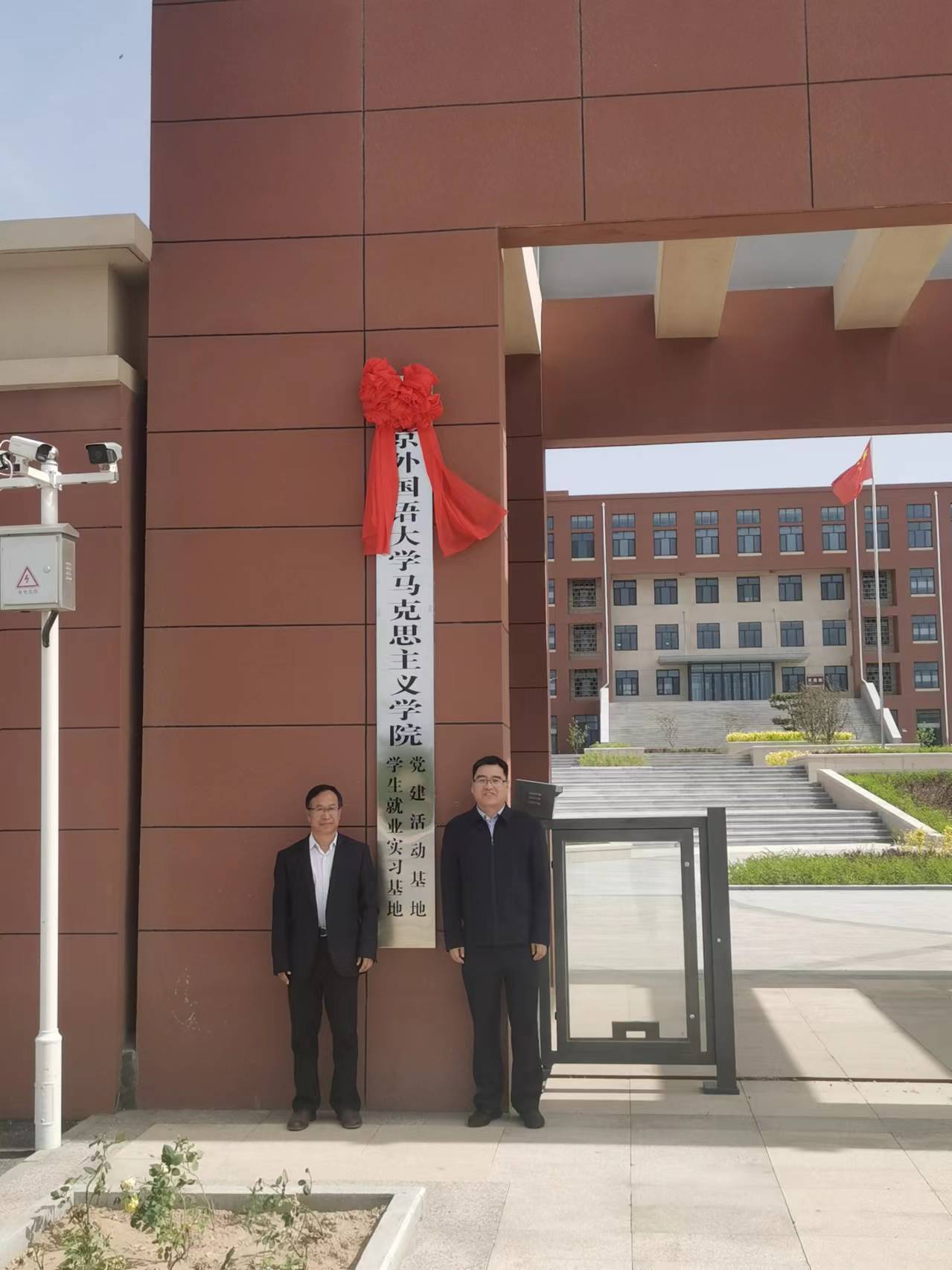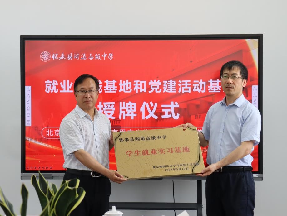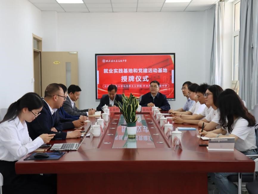 怀来闻道高级中学校长王金明首先向北外马克思主义学院一行的到来表示欢迎和感谢。他首先介绍了中学的办学宗旨、办学理念,在校学生规模和学校的发展目标,并介绍了两个单位定期联合开展思政教育、分享育人经验以及开展党建工作的有关计划。他指出,要以这次“学生就业实习基地”和“党建活动基地”的授牌为契机,欢迎北外马院学生来高中进行就业实习,将自己所学知识转化为授课本领,实现双向提高。王金明还介绍了学校党建和思政工作的开展情况,并指出,怀来具有丰富的革命文化教育资源,新保安战役纪念馆、董存瑞纪念馆都坐落在怀来,两个单位要充分发挥利用好这些资源,创新形式,开展大思政课实践教学,助推学生成长成才。