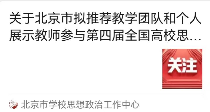 近日,根据《教育部办公厅关于开展第四届全国高校思政课教学展示活动的通知》,经全市各高校推荐、资格审查、专家评审,我院李永乐及其教学团队的《马克思主义基本原理》课程被北京市学校思想政治工作中心推荐,参加全国高校思政课教学展示活动。