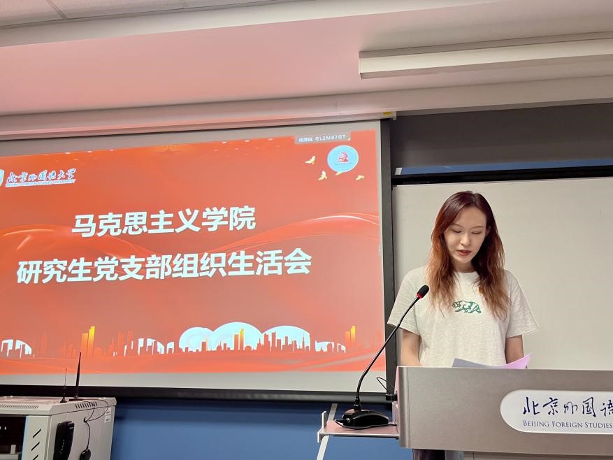 马克思主义学院研究生党支部宣传委员樊淑珍以全球化为主题,结合北外特色和专业实际指出,身处全球化时代,只有不断开拓国际视野,到国际舞台上展现青春风采,才能更好地讲好中国故事、发出中国声音,为世界贡献中国智慧和中国方案。作为北外马院的一员,要融汇中国情怀与国际情怀,既要扎根中国大地,吸吮中国传统优秀文化的思想精髓;又要开拓国际视野,吸收借鉴现代人类文明的一切有益成果,主动加强中外交流,提升跨文化交流能力。