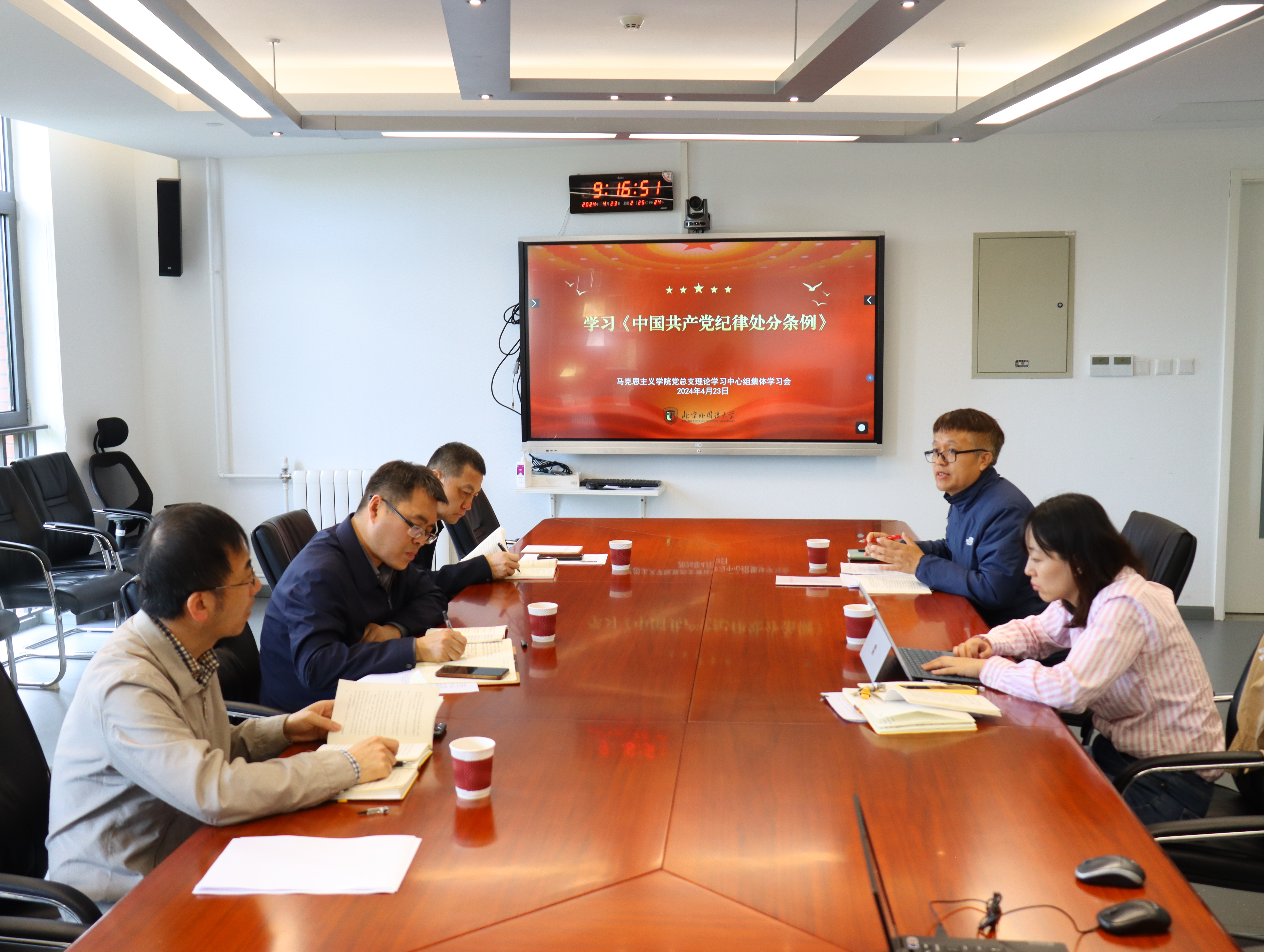 4月23日上午,马克思主义学院党总支理论学习中心组召开专题学习会,集体学习《中国共产党纪律处分条例》。