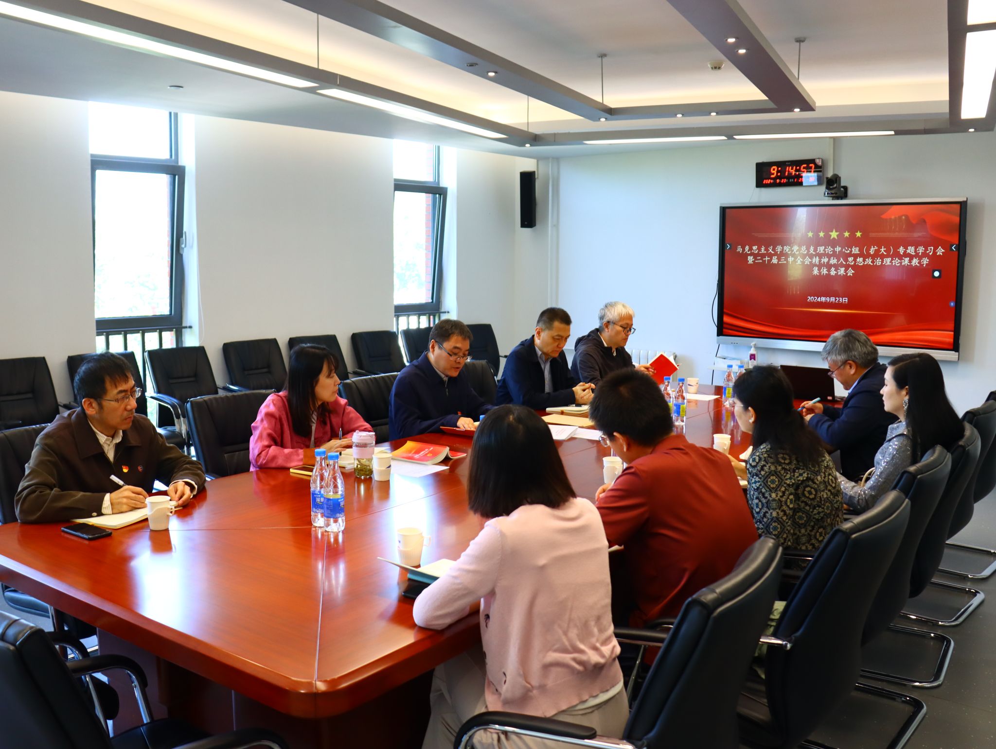 为学习贯彻党的二十届三中全会精神和全国教育大会精神,进一步推动党的二十届三中全会精神有机融入思政课教学,9月23日,马克思主义学院召开党总支理论中心组(扩大)专题学习会暨党的二十届三中全会精神融入思政课教学集体备课会。学院党政班子成员,理论学习中心组成员、各教研室主任、教工党支部书记、学生党支部书记参加会议。会议由党总支委员、副院长王曼倩主持。