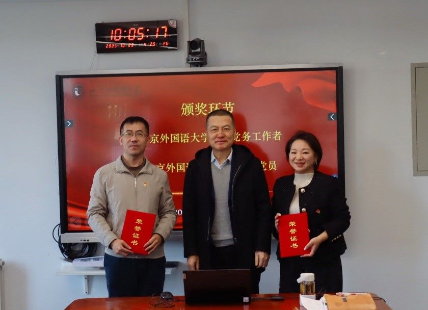 会上,党总支副书记、院长韩强为北京外国语大学2025年优秀共产党员、优秀党务工作者王浩、刘菁两位老师颁奖,并鼓励马院希望全体党员以受表彰的个人为榜样,筑牢信仰之基,坚持不懈用习近平新时代中国特色社会主义思想凝心铸魂